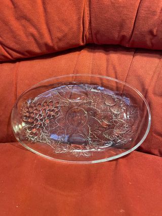 Elegante plato ovalado con un diseño grabado. - Diseño con motivos de hojas y frutos. - Borde ligeramente elevado.