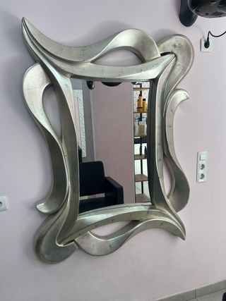 Elegante espejo con un diseño moderno y llamativo. - Marco con acabado plateado. - Diseño curvo y orgánico.