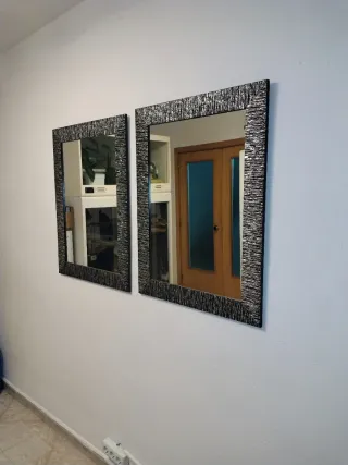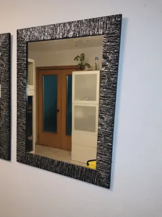 Elegante espejo con un marco de madera con un diseño texturizado en tonos negros y plateados. Medidas: 84cm x 65cm cada uno. Vendo juntos o separados. Precio por unidad. - Marco con acabado texturizado. - Diseño moderno y llamativo.
