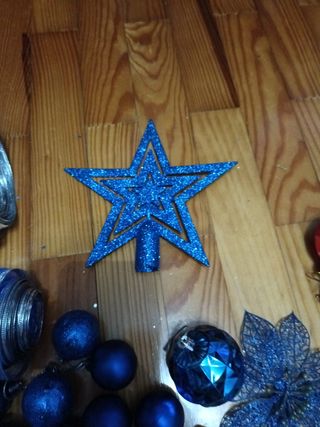 decoracion arbol 22 esferas pequeñas azules 1 estrella, 2 flores, 2 cintas azul transparente decoradas 2.30mts, 3 cintas plateadas de lentejuelas 2.30mts...regalo bota y bolas roja, y 2 rayos azules de 1mt y metro y 1/2