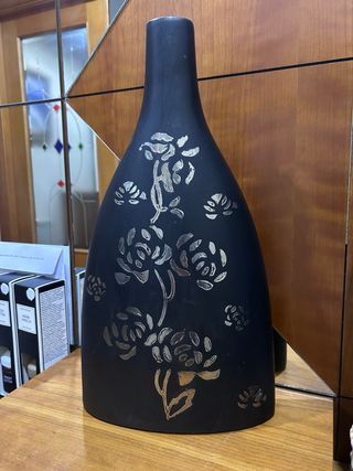 Elegante jarrón de gran tamaño con un acabado metálico en tono plateado y detalles en rosa. - Diseño ovalado. - Acabado texturizado.