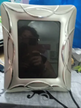 Marco de fotos con un diseño elegante y acabado plateado. Ideal para colocar tus recuerdos más preciados. - Acabado metálico brillante. - Diseño con bordes curvos.