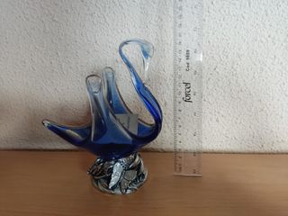 Elegante cisne decorativo de cristal azul con una base detallada. - Pie con diseño de hojas bañado en plata. - Pieza de cristal soplado con acabado brillante.