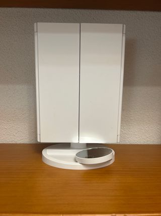 Precioso y elegante espejo de tocador de tres hojas con luz LED integrada. Es perfecto para maquillarse,depilarse o arreglarse el pelo. 28 cm de alto ,ancho 35cm. - Diseño plegable para un fácil almacenamiento. - Base con compartimento para guardar pequeños objetos. - Iluminación LED para una visión clara y nítida. Funciona con pilas o se carga por usb no incluye. En la última foto aparece en la parte del joyero una manchita que no sé quita,no sé ve mucho. No es negociable. Muchas más cosas en mi perfil ....