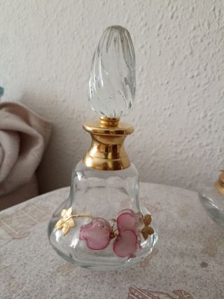 Elegante juego de tocador antiguo, ideal para añadir un toque de distinción a tu habitación. Se compone de dos piezas: un frasco perfumero y un frasco pequeño con tapa. - Frasco perfumero con tapón de cristal facetado. - Ambos frascos con detalles en dorado. - Decoración floral en relieve en color rosa. - Piezas de cristal transparente con detalles delicados.