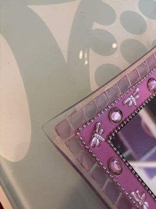 Preciosa bandeja con espejo, ideal para tocador. Tiene un diseño delicado con detalles en cerámica y cristal. - Espejo de forma cuadrada. - Decorado con pequeños mosaicos. - Adornos plateados y mariposas rosas. ligeros desperfectos