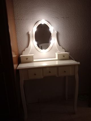 Tocador con espejo de aumento y retroiluminado. Vintage finales de los 70, Procedente de Aurora, Illinois, U.S.A. y fabricada por The Ton Ton Company, The NOVA. Fue importada a España hace más de 30 años. Se ha convertido a LED, modificando el casquillo a E14 y sustituyendo el enchufe por uno europeo de 220v en color oro a juego con la misma. Se entregan 2 bombillas, la de color blanco frío que se ve en la fotografía y otra color cálido tipo filamento también de led. En muy buen estado de conservación como se puede observar, mantiene el cable de origen en perfecto estado. Preferible entrega en mano por la delicadeza dé la pieza.