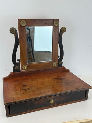 Elegante espejo de tocador con un diseño de estilo Imperio. 46x48x31 cms - Marco de madera con detalles metálicos dorados. - Base de madera con un cajón. - Soporte curvo con remates decorativos.