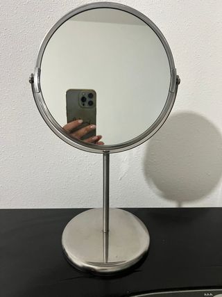 Este espejo de mesa es perfecto para tu tocador o escritorio. Su diseño moderno se adapta a cualquier espacio. - Marco de metal plateado. - Base redonda y estable.