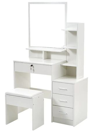Tocador elegante con espejo integrado y un cajón con cerradura. - Estructura de madera. - Acabado en color blanco. - Incluye espejo. - Un cajón con llave. - Taburete a juego. Se nota signos de desgaste, el fondo de los cajones está forrados porque por el tiempo el tono blanco se había desgastado. Hay algunos tornillos que se han perdido debido a la mudanza pero no son imprescindibles porque se sujeta bien