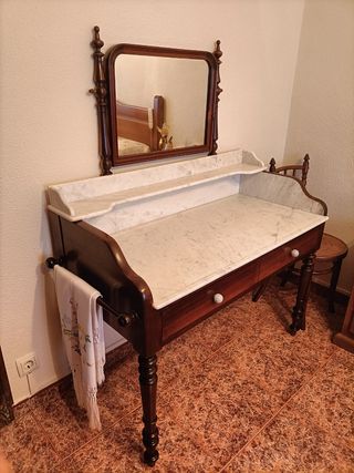 URGE VENTA POR MUDANZA!!!Elegante tocador antiguo para dormitorio, con un diseño clásico y funcional. Finales siglo XIX - Encimera de mármol. - Estructura de madera. - Dos cajones superiores. - Puertas inferiores con tiradores. - Espejo con soportes decorativos. NO SE HACE ENVIO.SOLO PARA RECOGER EN PAMPLONA.