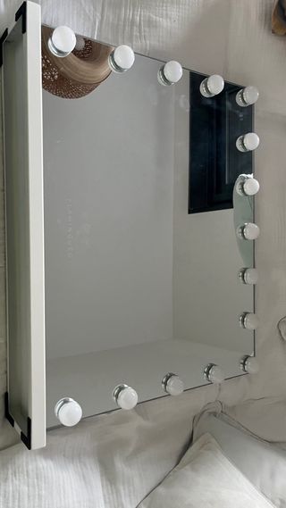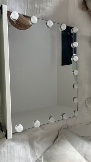 Espejo de tocador con luz LED, ideal para maquillaje y cuidado personal. Su diseño moderno se adapta a cualquier espacio. Sin estrenar. - Luz LED integrada. - Ángulo ajustable. - Espejo cosmético extraíble. - Desmontable