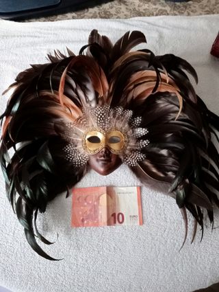 Mascara comprada en Venecia, con preciosas plumas, con cinta para colgar, cómo decoración. Medidas 43 cm ancho por las plumas y desde la barbilla hasta las plumas, hacia arriba 30cm.
