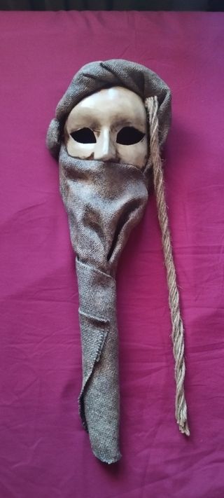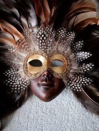 Preciosa máscara veneciana hecha a mano. Ideal para coleccionistas o amantes del teatro, o bien, para amantes de la decoración. - Máscara única y detallada. - Confeccionada con materiales de alta calidad. - Diseño elegante y misterioso. Es completamente rígida, menos el cordón que cuelga. Perfecta para decorar un rincón, una escalera, una entradita o un pasillo. Fue comprada personalmente en Venecia, en una tienda exclusiva de una de las avenidas principales. Precio de compra: 60€