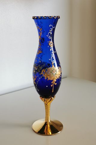 Jarrón de fino cristal color azul cobalto decorado con oro 24k y flores de porcelana en relieve. Decorado a mano. En perfecto estado. Medidas: 27 cm alto x 8 cm de ancho. Hay que distinguir el vidrio de Murano, más grueso y pesado, del cristal de Murano, extremadamente fino y transparente, como es este jarrón. Todo un lujo. Todas las piezas que vende nuestra tienda son vintage/antiguas por lo que pueden mostrar cierto desgaste y signos de edad. Por favor, amplíe las fotos para juzgar la condición según sus propios estándares. 127*23
