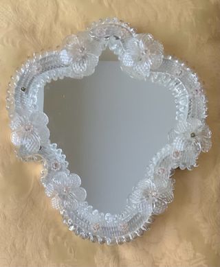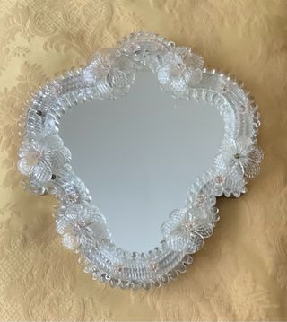 Precioso espejo veneciano con un diseño delicado y elegante. - Marco circular de cristal transparente. - Adornado con dos flores de cristal rosa. - Borde con detalles ondulados.