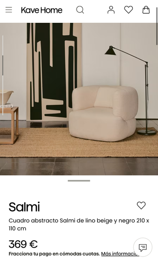 🖼️ Cuadro abstracto Salmi – Kave Home Cuadro decorativo Salmi de lino en tonos beige y negro, con diseño abstracto y relieve. Juega con el positivo y negativo del color mediante la superposición de formas geométricas redondeadas, con textura granulada que realza la delicadeza de la composición. 📏 Medidas: 210 x 110 cm 🆕 Estado: nuevo, en su caja original Materiales: lino y yute. 🚫 Fuera de stock en tienda 💰 Precio original: 369 € en Kave Home Westwing / La Redoute / The Masie / Sklum / HM Home / Zara Home