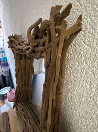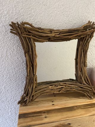 Elegante espejo con un marco único hecho de ramas de madera natural. Aporta un toque rústico y orgánico a cualquier espacio. - Marco artesanal con ramas de madera. - Diseño orgánico y natural.