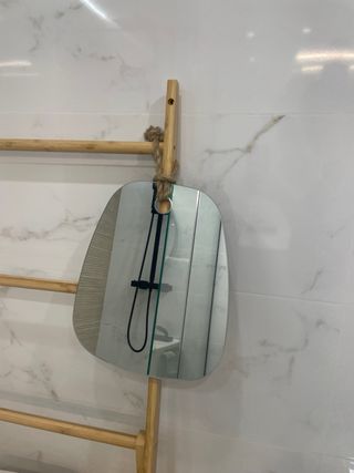 Este espejo de forma irregular añade un toque moderno a cualquier espacio. Su diseño orgánico y colgante de cuerda lo hace destacar. - Cuerda - Superficie de cristal.