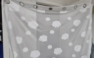 Cortina decorativa con un diseño de nubes blancas con tela de lino blanco. Perfecta para añadir un toque tierno a cualquier habitación. 130cm de ancho 250cm de largo. Nueva, nunca se usó - Diseño de nubes en relieve. - Ojales metálicos para colgar.