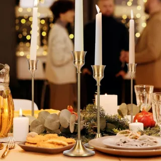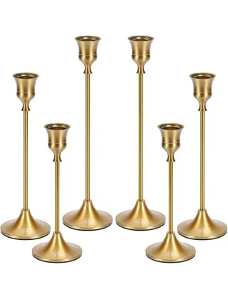 Conjunto de seis candelabros cónicos con un elegante acabado dorado. Añaden un toque de sofisticación a cualquier espacio. - Diseño cónico. - Base estable.