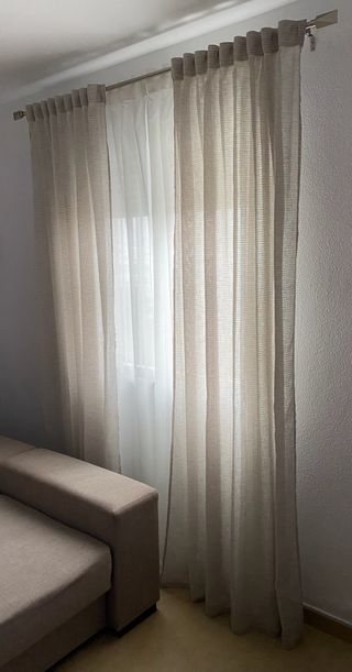 Juego de cortinas para salón en tonos beige y blanco. Añaden un toque elegante a cualquier habitación. - Confeccionadas en tela. - Diseño moderno y versátil.