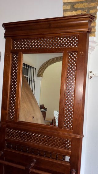 Mueble de entrada de madera con espejo. - Diseño con celosía. - Acabado en tono marrón.