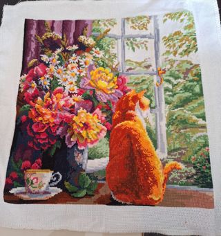 Bordado a mano en punto de cruz de un gato mirando por la ventana. Terminado. Listo para enmarcar. Tipo: punto de cruz. Hebras: 2 hilos por puntada. PRODUCTO TERMINADO Todos mis trabajos son únicos y auténticos hechos a mano. Estoy segura que no hay mejor regalo para un coleccionista, que algo único y fantástico!! También, utilizo técnicas complejas y únicas de bordado a mano, elaboradas por mí misma! Espero que mis trabajos traigan felicidad y amor a vuestra casa! LAVAR A MAQUINA MAX.30oC EN MODO SEDA/LANA EN UNA BOLSA ESPECIAL O LAVAR A MANO Se vende sin bastidor ni marco. Se hacen envíos. No se hacen devoluciones.