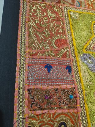 Tapiz decorativo con diseño de elefante, con muchos brillos y detalles. En el centro se encuentra un elefante. Tapiz traído de la India. Tenemos más modelos. Dimensiones aproximadas: 153x104cm - Diseño de elefante central. - Bordados y lentejuelas. - Múltiples parches de tela colorida.
