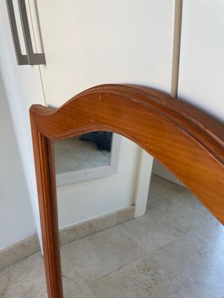 Elegante espejo con marco de madera y cristal.Marco de madera con acabado natural. Diseño curvo en la parte superior. Buena calidad. Más de 15 años con él. Se vende en persona (Estepona)