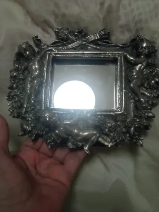 Elegante espejo de sobremesa ,plata con un diseño clásico y detallado. Presenta figuras de querubines y motivos florales.Periodo 1940 - 1950.Se puede colgar o poner tal cual. Es muy bonito,elegante y atemporal ,ideal coleccionistas.. Medidas 18.4 x15.9,ver fotos. - Marco ornamentado con querubines. - Adornos florales. - Acabado plateado.