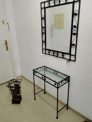 Conjunto de entrada con espejo y paragüero. - Estructura metálica con detalles decorativos. - Superficie del espejo de cristal. - Paragüero con interior de mimbre.