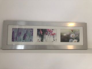 Elegante cuadro decorativo con tres fotografías de flores. Perfecto para añadir un toque de color y naturaleza a tu hogar. - Marco de metal plateado. - Cristales de protección. - Diseño alargado.