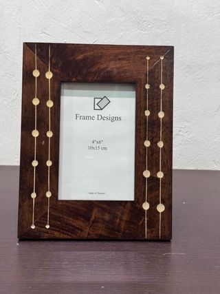 Portafotos de madera tamaño de fotografía 10x15 con un diseño único y elegante. Perfecto para exhibir tus recuerdos más preciados. - Diseño con detalles de puntos dorados. - Acabado natural de la madera.