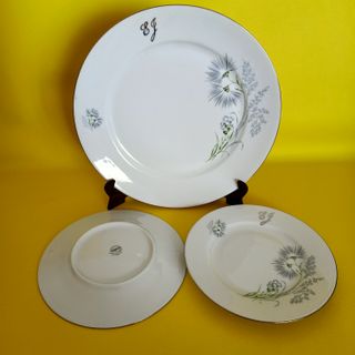 Elegante vajilla de porcelana con un delicado diseño floral y borde Plateado. Cada plato presenta un monograma 'EJ'. Plato fuente de servicio y 11 platos postre. - Diseño floral en tonos grises y verdes. - Borde con acabado plateado. - Monograma 'EJ' en cada plato.