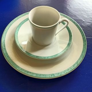 Elegante juego de vajilla con un diseño clásico y un toque moderno. - Taza de porcelana blanca. - Plato de porcelana blanco con borde verde. - Plato de servicio de porcelana blanco con borde verde.