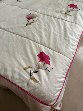 Edredón con un bonito estampado floral, ideal para camas de 105 cm. - Diseño con flores en tonos rosas y beige. - Acabado con ribete rosa. - Textura suave y acolchada.