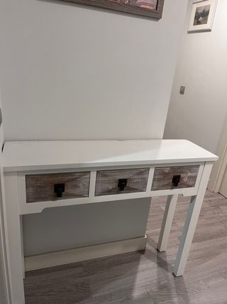 Elegante mueble recibidor con un diseño moderno y funcional. - Acabado en blanco y detalles en madera. - Tres cajones con tiradores negros.
