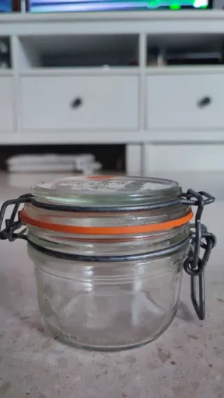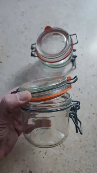 Botes de cristal con cierre hermético. - Material: Cristal y metal. - Cierre de alambre con junta de goma naranja. 1€/unidad