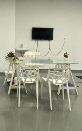 Elegante mesa de comedor con superficie de cristal y estructura metálica. - Diseño moderno y minimalista. - Patas robustas para mayor estabilidad.