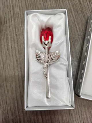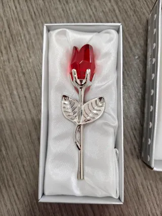 Rosa decorativa con flor de cristal rojo facetado y tallo metálico plateado. Viene presentada en su caja original, ideal para regalo romántico o detalle especial. ✨ Características: • Flor de cristal rojo brillante • Tallo y hojas de metal plateado (NO es plata) • Diseño elegante y decorativo • Incluye caja regalo • Estado: nuevo, sin uso 🎁 Ideal como: • Regalo romántico • Detalle para aniversario o San Valentín • Decoración simbólica 📦 Envío rápido y embalaje cuidadoso. Si tienes dudas, escríbeme sin compromiso😃