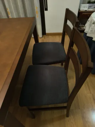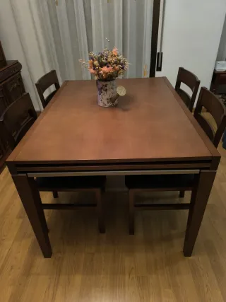 Mesa de comedor rectangular de madera maciza. Su diseño abatible permite adaptarla a diferentes espacios.4 sillas a juego. Un pequeño desgaste en la parte superior. - Acabado en tono marrón. - Material de madera resistente.