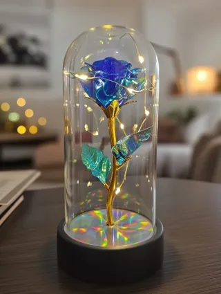Rosa decorativa de color azul con acabado brillante, presentada dentro de una cúpula transparente con iluminación integrada. Un objeto decorativo elegante y llamativo, perfecto como regalo romántico o detalle especial. ✨ Características: • Rosa decorativa azul con efecto brillante • Cúpula protectora transparente • Iluminación decorativa • Diseño moderno y elegante • Ideal para decoración o regalo • Estado: nuevo, sin uso 🎁 Perfecta para sorprender en aniversarios, San Valentín, cumpleaños o como elemento decorativo con luz ambiental. 📦 Envío rápido y embalaje cuidadoso. Si tienes cualquier duda, escríbeme sin compromiso😃
