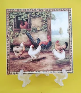Bonita cerámica decorativa con una escena campestre de gallinas. - Diseño detallado de aves de corral. - Marco con motivos decorativos.