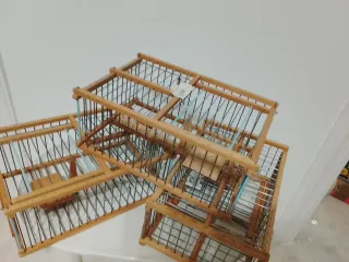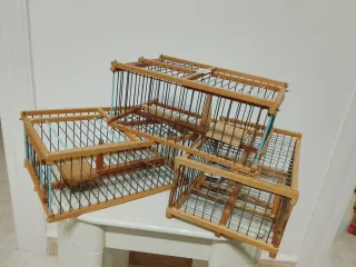 Conjunto de tres jaulas de madera, ideales para reclamo. - Construcción robusta en madera. - Barras metálicas para seguridad. - Diseño tradicional para aves.