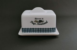 Mantequillera de porcelana con un diseño encantador. - Presenta un borde a cuadros azul y blanco. - Decorada con un dibujo de una granja y el texto Beurre de Pays Normand.