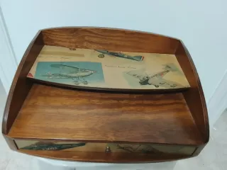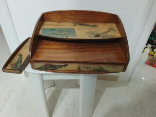 Original mueble de madera con un diseño único. - Cajón frontal con ilustración de aviones. - Compartimento superior con lámina decorativa de aeronaves. - Laterales con detalles gráficos de aviones.