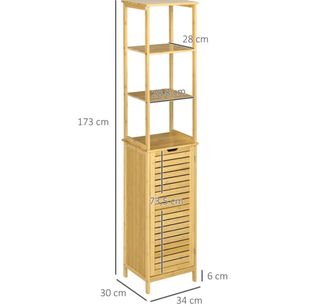 Estantería alta de bambú con un diseño moderno y funcional para tu baño. - Estructura de bambú natural. - Múltiples estantes abiertos. - Compartimento inferior con puerta de lamas.