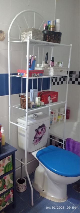 Práctico estante de dos niveles para colocar sobre la cisterna del inodoro. Ideal para organizar tus artículos de baño. - Fabricado en metal. - Color blanco. - Sin estrenar ya que en mi baño golpea con un espejo que tenemos sobre el lavabo y el inodoro.