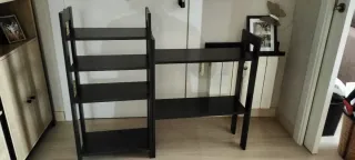 3 estanterías altas de color negro con varios estantes. Ideal para organizar libros, figuras o elementos decorativos. Están en muy buen estado, y se encuentran en Burgos capital. El precio es por unidad. En mi perfil hay más muebles que complementan perfectamente con esta estantería, como es una mesa de oficina/despacho o un aparador. - Diseño moderno y funcional. - Puerta inferior con bisagras.